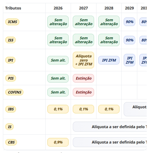 extinção definitiva do PIS e da Cofins. A CBS passa a vigorar com alíquota cheia, estimada em cerca de 8,8%. O IPI é zerado para a maioria dos produtos, com exceção dos fabricados na Zona Franca de Manaus.