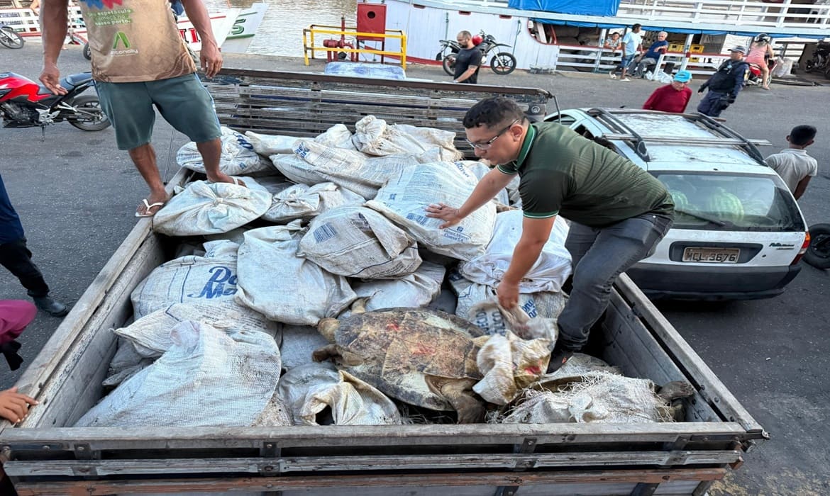 Carregamento ilegal com 49 tartarugas-da-Amazônia apreendido por fiscais ambientais no Porto de Parintins