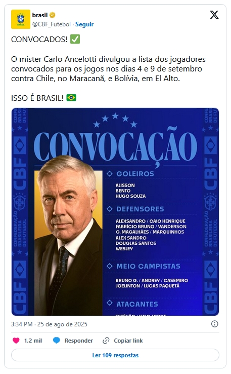 “Quero conhecer novos jogadores que podem ajudar a seleção, tanto no perfil técnico quanto o pessoal. Os jogadores que não estou chamando trabalharam muito bem na primeira convocação”, ressaltou Ancelotti, que também elogiou Lucas Paquetá. Quero aproveitar para conhecê-lo: tem muita qualidade e será muito importante para o Brasil.”