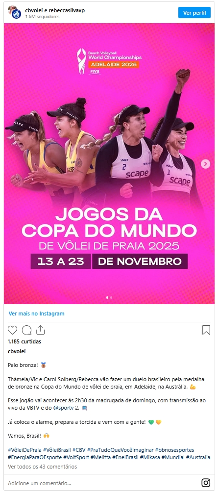 No domingo (23), após o confronto 100% brasileiro pelo bronze, haverá a decisão do título mundial masculino com duas duplas da Suécia: os campeões olímpicos Ähman e Hellvig terão pela frente os compatriotas Hölting Nilsson e Andersson às 3h30. Na sequência, as letãs Tina/Anastasija e as norte-americanas Nuss/Brasher duelarão pelo ouro a partir das 6h30.