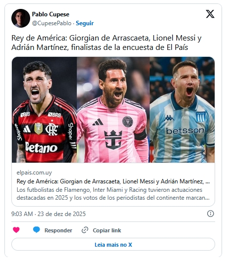 O meio-campista uruguaio Giorgian de Arrascaeta, do Flamengo, é um dos finalistas da edição 2025 do tradicional Prêmio Rei da América, concedido pelo jornal uruguaio El País. O camisa 10 do Rubro-Negro da Gávea tem como concorrentes o craque argentino Lionel Messi, do Inter Miami (Estados Unidos), e o atacante Adrián Martínez, do Racing (Argentina).