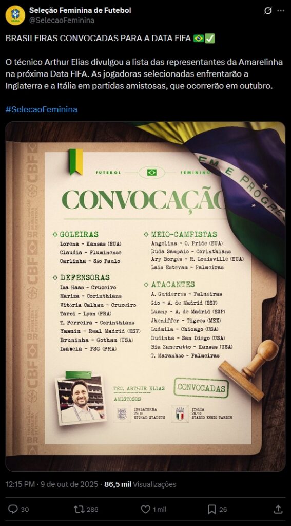 Campeã da Copa América Feminina, a seleção brasileira voltará a campo modificada para os amistosos fora de casa contra a Inglaterra e Itália, nos dias 25 e 28 de outubro, respectivamente. Nesta quinta-feira (9), o técnico Arthur Elias convocou 23 jogadoras para enfrentar duas potências do futebol europeu como preparação para a Copa do Mundo de 2027, no Brasil. A Inglaterra é bicampeã continental e vice mundial, e a Itália foi semifinalista na última edição da Europa.