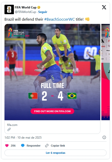 O Brasil está na decisão da Copa do Mundo de beach soccer. A classificação veio neste sábado (10) com uma vitória por 4 a 2 sobre Portugal, na Paradise Arena, em Victoria (Seicheles), pelas semifinais da competição.