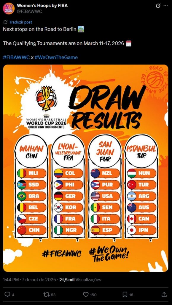A seleção brasileira feminina de basquete já sabe quais serão seus adversários nas Eliminatórias da Copa do Mundo 2026. Um sorteio realizado pela Federação Internacional (Fiba), nesta terça-feira (7), distribuiu 24 seleções por quatro torneios classificatórios. O Brasil está no Torneio A, junto com Mali, Sudão do Sul, República Tcheca, Bélgica e China (anfitriã). A disputa ocorrerá na cidade chinesa de Wuhan, entre 11 e 17 de março do ano que vem. Os outros três torneios serão em San Juan (Porto Rico), Istambul (Turquia) e Lyon-Villeurbanne (França).