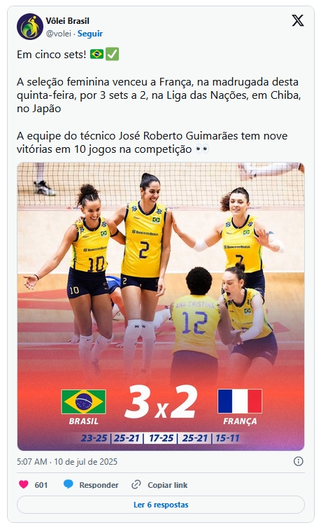 Já classificado, de forma antecipada, para a fase final da Liga das Nações de Vôlei (VNL) feminino, o Brasil derrotou a França por 3 sets a 2 (parciais de 23/25, 25/21, 17/25, 25/21 e 15/11), nesta quinta-feira (10) em Chiba (Japão). Este é o segundo triunfo da equipe brasileira na terceira e última semana da primeira fase da competição.