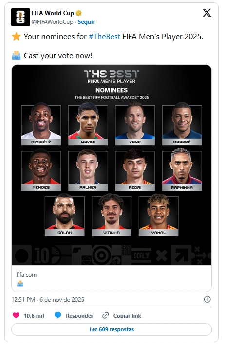 O atacante brasileiro Raphinha, da seleção brasileira e do Barcelona (Espanha), é um dos 11 finalistas do prêmio de melhor jogador do The Best 2025, premiação da Fifa que aponta os melhores do mundo na última temporada.
