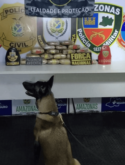 Após farejar por toda a embarcação, a cadela policial Athena, localizou as drogas embutidas no espelho da embarcação. No total, foram apreendidos 18,4 quilos de maconha skunk, 5,1 quilos de pasta base de cocaína e 2,7 quilos de cocaína em pó.