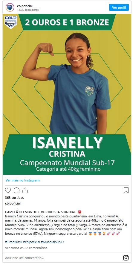 A carioca Isanelly Cristina deu prova de que é um dos nomes mais promissores do levantamento de peso brasileiro ao conquistar, com apenas 14 anos de idade, o título no Mundial sub-17 de Levantamento de Pesos, oportunidade na qual estabeleceu um novo recorde mundial no arremesso.