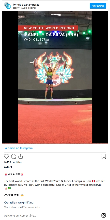 O feito foi alcançado na última quarta-feira (30) em Lima (Peru), quando a brasileira levantou 77 quilos no arremesso, estabelecendo o recorde, e conseguiu 57 quilos no arranco, somando o total de 134 quilos.