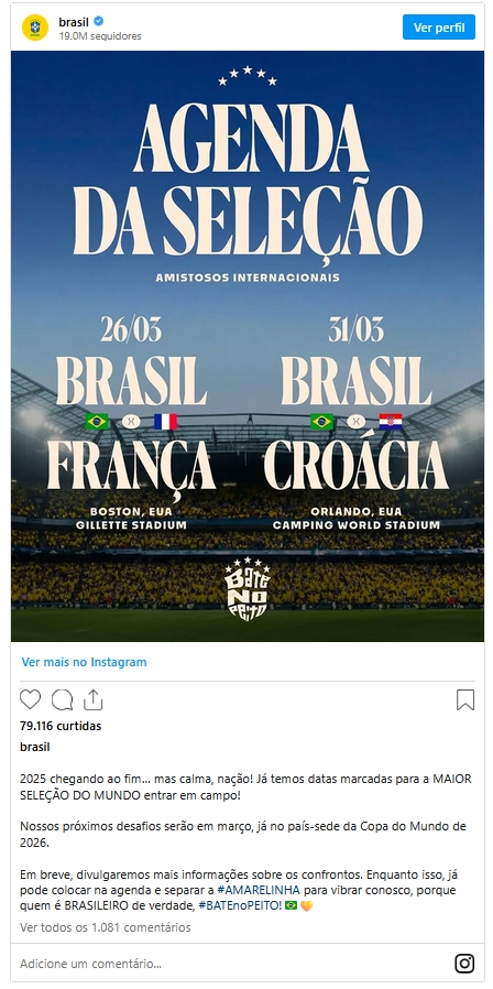 A Confederação Brasileira de Futebol (CBF) anunciou as datas dos amistosos da seleção brasileira contra a França e contra a Croácia. As partidas estão entre os últimos testes do Brasil antes do início da Copa do Mundo de 2026, que será realizada entre 11 de junho e 19 de julho no México, no Canadá e nos Estados Unidos.