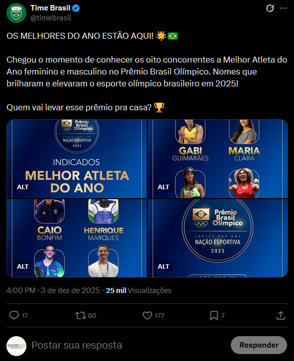 “O Prêmio Brasil Olímpico é uma homenagem às melhores performances dos atletas brasileiros no ano. Todos mostraram um grande desempenho. E dentre os melhores resultados em todas as modalidades olímpicas existem aqueles que marcaram seus nomes na história nesta temporada. Quando olhamos a lista dos melhores, foi fácil identificar que esses oito atletas, de sete esportes olímpicos diferentes, tiveram um 2025 fantástico e mostraram a diversidade do Time Brasil”, declarou o diretor-geral do COB, Emanuel Rego.