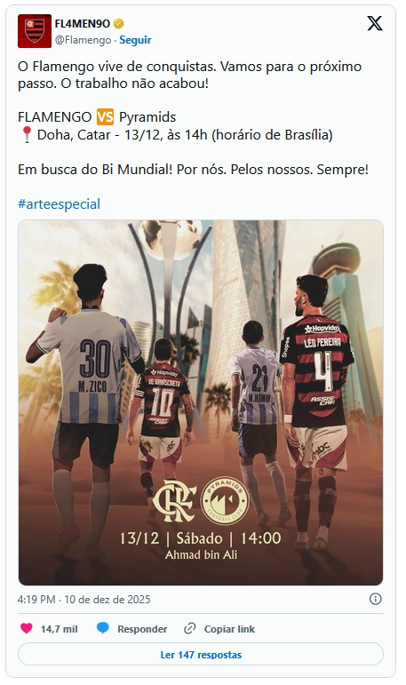 Em busca da classificação para a decisão da Copa Intercontinental de clubes da Fifa, o Flamengo entra em campo contra o Pyramids (Egito) a partir das 14h (horário de Brasília) deste sábado (13) no estádio Ahmad bin Ali, na cidade de Al Rayan (Catar).