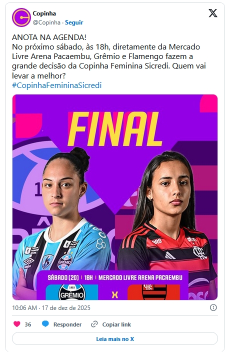 A Federação Paulista de Futebol anunciou, nesta quarta-feira (17), o horário da decisão da Copinha Feminina. O confronto entre Flamengo e Grêmio será disputado a partir das 18h (horário de Brasília) do próximo sábado (20) no estádio do Pacaembu, em São Paulo.
