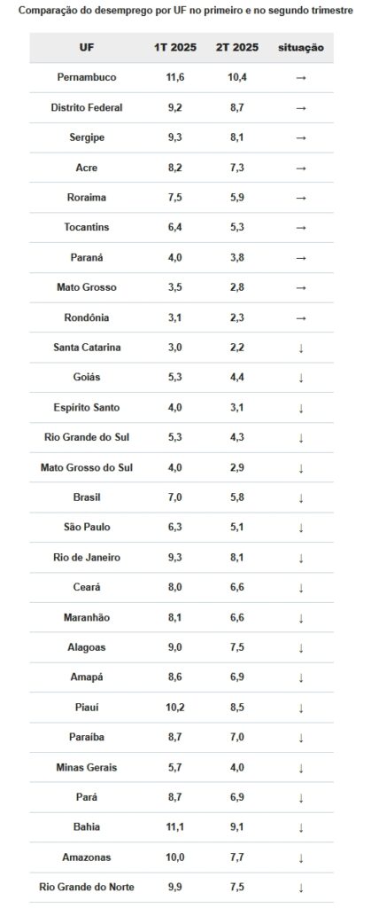 No segundo trimestre, a desocupação no país caiu 1,2% em relação ao índice registrado no primeiro trimestre deste ano, que foi de 7%. No recorte das Unidades da Federação, as menores taxas foram registradas em Santa Catarina (2,2%), Rondônia (2,3%) e Mato Grosso (2,8%). As maiores, em Pernambuco (10,4%), Bahia (9,1%) e Distrito Federal (8,7%).