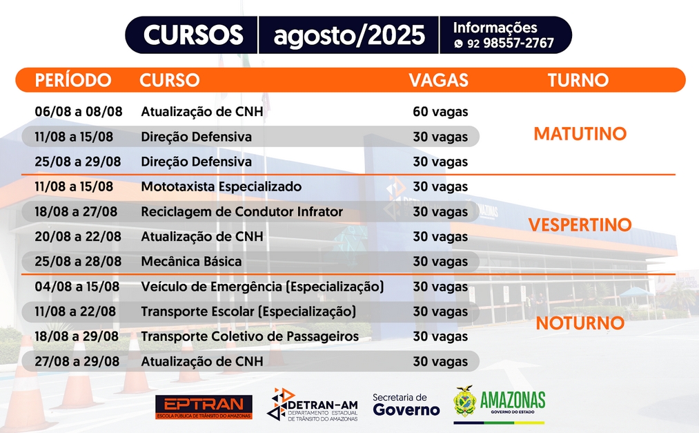 O Departamento Estadual de Trânsito do Amazonas (Detran-AM), por meio da Escola Pública de Trânsito (Eptran), está com inscrições abertas para cursos gratuitos que serão ministrados ao longo do mês de agosto. Ao todo, 360 vagas estão sendo oferecidas para os turnos matutino, vespertino e noturno.