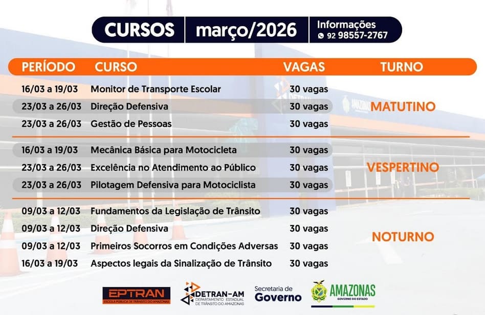 O Departamento Estadual de Trânsito do Amazonas (Detran-AM), por meio da Escola Pública de Trânsito (Eptran), está com inscrições abertas para cursos gratuitos que serão ministrados no mês de março. São oferecidas 300 vagas, com turmas nos turnos matutino, vespertino e noturno.