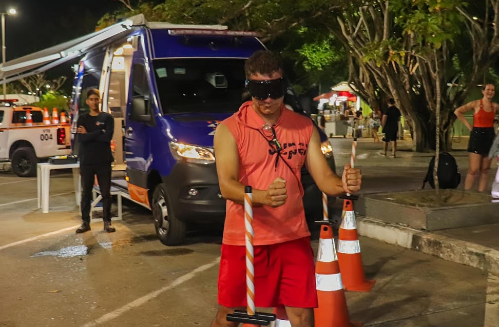 Participando da atividade com óculos simulador de embriaguez e uso de drogas, o designer Rafael dos Santos, 36, compreendeu como as substâncias afetam a percepção do condutor. “A parte com óculos de álcool foi um pouco mais fácil, mas em um determinado pedaço do percurso, já não estava dando para enxergar muito bem. Mas, com o de droga, não tinha condição de ver nada. Bati em dois obstáculos e foi difícil. É melhor não dirigir embriagado nem sob efeito de drogas”, relatou o designer.