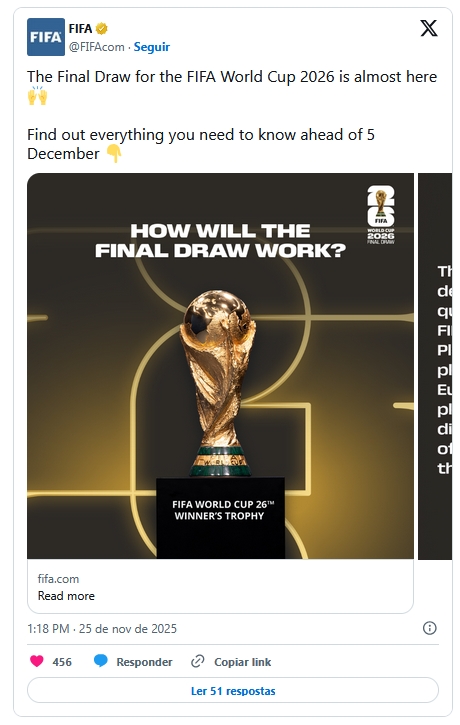 “Os procedimentos do sorteio final estabelecem que os países-sede – Canadá, México e Estados Unidos – serão alocados no pote 1. As outras 39 seleções classificadas serão distribuídas nos quatro potes de 12 equipes cada, de acordo com o Ranking Mundial Masculino da Fifa publicado no dia 19 de novembro de 2025. Por fim, as duas vagas referentes ao torneio de repescagem da Copa do Mundo de 2026, assim como as quatro vagas da repescagem europeia, serão alocadas no pote 4”, informou a Fifa por meio de um comunicado oficial.