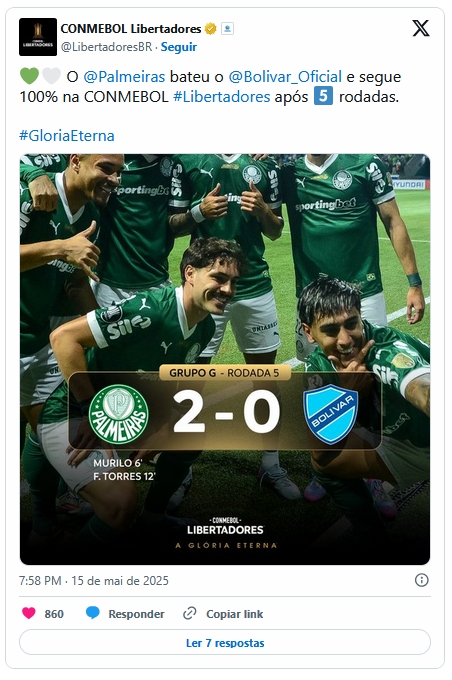 Quem continua sobrando na Libertadores é o Palmeiras, que bateu o Bolívar (Bolívia) por 2 a 0, no Allianz Parque, para permanecer com 100% de aproveitamento no Grupo G e garantir a melhor campanha geral da primeira fase da competição.