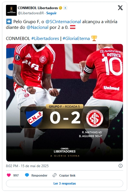 O terceiro brasileiro em ação pela competição continental nesta quinta foi o Internacional, que também triunfou pelo placar de 2 a 0. Mas a vitória foi fora de casa, no estádio Parque Central, em Montevidéu, sobre o Nacional (Uruguai).