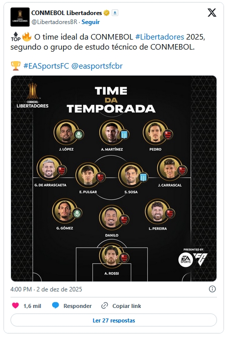 O Flamengo domina a seleção da última Copa Libertadores da América. O Rubro-Negro da Gávea, que conquistou o tetracampeonato da competição ao derrotar o Palmeiras por 1 a 0 no último sábado (29) em Lima (Peru), tem sete jogadores na equipe ideal da competição divulgada nesta terça-feira (2) pela Conmebol (Confederação Sul-Americana de Futebol).