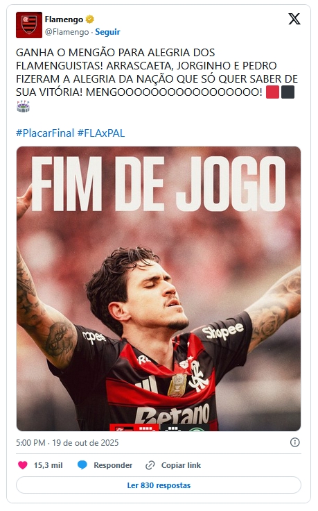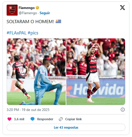 Porém, o Rubro-Negro conseguiu segurar a pressão inicial do Palmeiras e foi mais eficiente para ficar em vantagem aos nove minutos. O goleiro Rossi acertou lançamento para Pedro, que, com grande categoria, se livrou da marcação do zagueiro Bruno Fuchs antes de lançar em profundidade para Arrascaeta, que partiu em velocidade para bater na saída do goleiro Carlos Miguel.