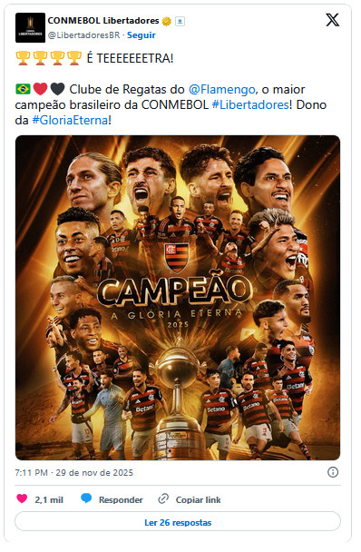 O primeiro tetracampeão da América do futebol brasileiro se chama Clube de Regatas do Flamengo. Neste sábado (29), o Rubro-Negro se tornou o time do Brasil com mais títulos de Libertadores ao derrotar o Palmeiras por 1 a 0 no Estádio Monumental de U, em Lima (Peru). A partida foi transmitida ao vivo pela Rádio Nacional.