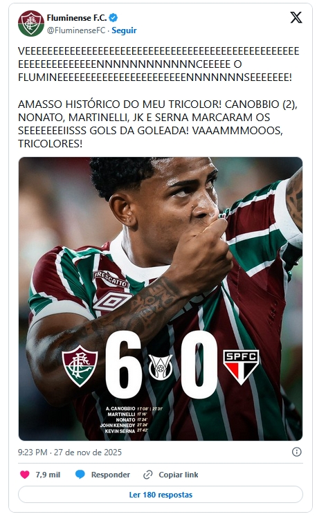 O Fluminense goleou o São Paulo por 6 a 0, na noite desta quinta-feira (27) no estádio do Maracanã, e garantiu a classificação para a próxima edição da Copa Libertadores da América, ainda na fase prévia. O triunfo foi válido pela 36ª rodada do Campeonato Brasileiro.