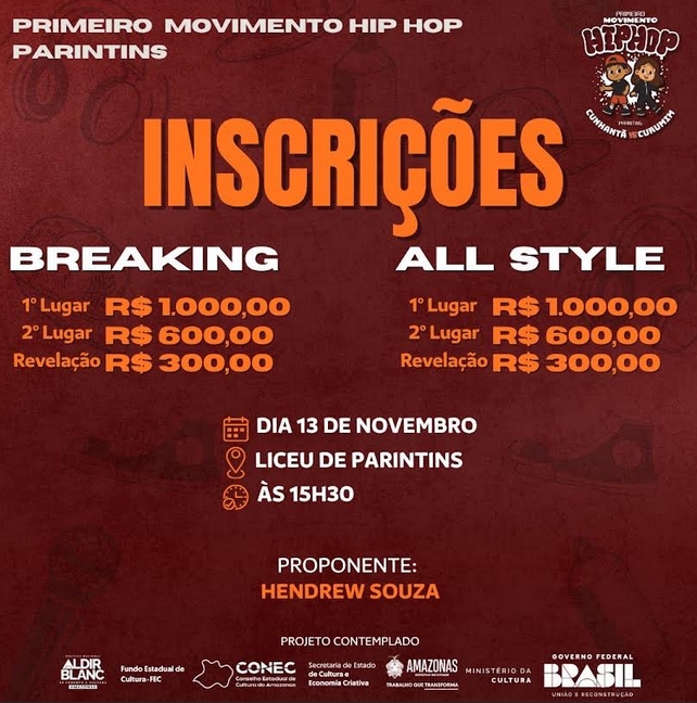 As inscrições para o 1º Movimento Hip Hop Parintins – Cunhantã vs Curumim acontecem nesta quarta-feira (13 de novembro), às 15h30, no Liceu de Artes e Ofícios Cláudio Santoro (Unidade Parintins). O projeto, proposto por Hendrew Souza e contemplado pela Política Nacional Aldir Blanc de Fomento à Cultura, busca incentivar a participação de crianças e adolescentes em batalhas de dança, revelando novos talentos da cultura Hip Hop.