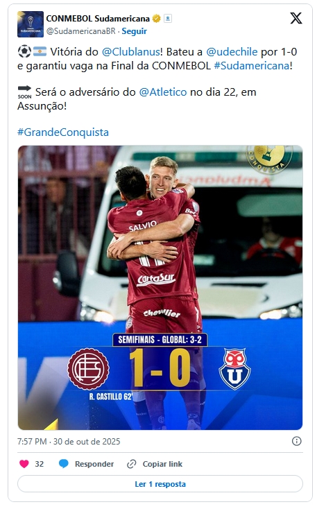 O Atlético-MG conheceu na noite desta quinta-feira (30) o seu adversário na decisão da Copa Sul-Americana. Jogando no estádio La Fortaleza, o Lanús (Argentina) derrotou o Universidad de Chile (Chile) por 1 a 0, gol do atacante Rodrigo Castillo, e se garantiu na final da competição.