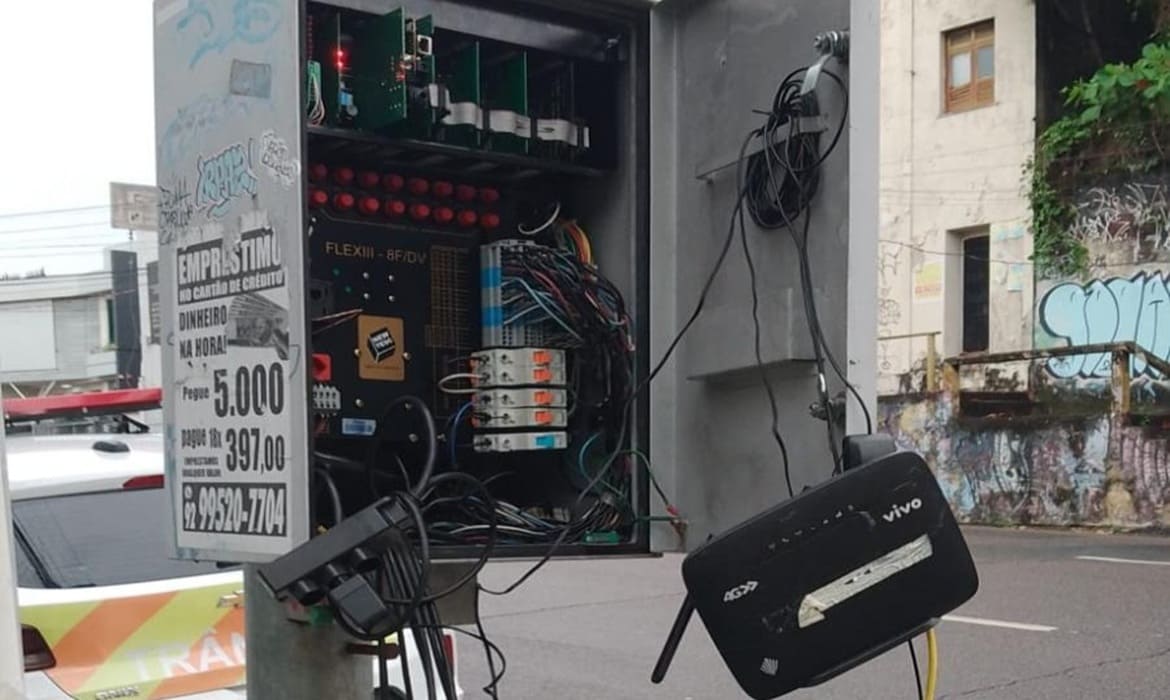 Caixa controladora do semáforo no cruzamento da avenida Getúlio Vargas com a rua Leonardo Malcher, no Centro, danificada por ato de vandalismo