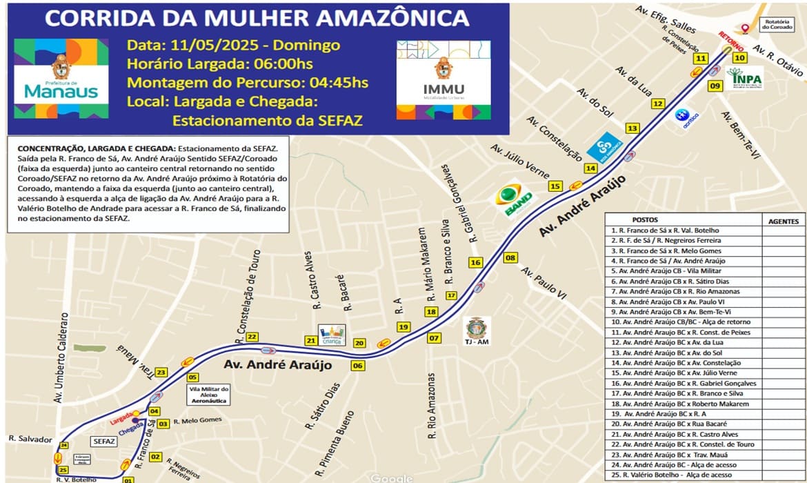 A Prefeitura de Manaus, por meio do Instituto Municipal de Mobilidade Urbana (IMMU), informa que, neste domingo, 11/5, entre 4h e 9h, trechos da avenida
