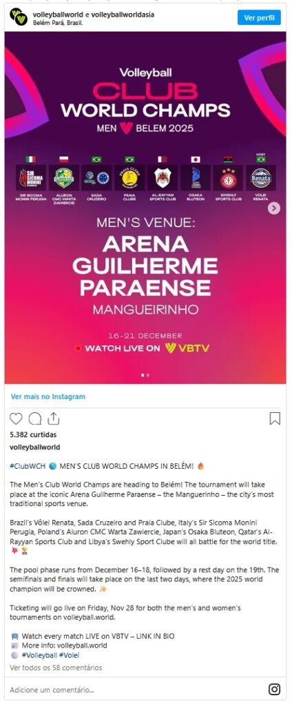 O Ginásio Guilherme Paraense, o Mangueirinho, em Belém (PA), será palco do Mundial de Clubes de vôlei masculino a partir desta terça-feira (16). O Brasil conta três times entre os oito participantes. Atual campeão, o Cruzeiro será o primeiro a estrear: às 10h (horário de Brasília), a equipe mineira encara o Osaka Bluteon (Japão), pelo Grupo B. Já o conterrâneo Praia Clube enfrenta o Al-Rayyan (Catar) às 17h e o Vôlei Renata, de Campinas (SP) duela com o Zawiercie (Polônia) às 20h30 – ambos os jogos pelo Grupo A. As partidas terão transmissão ao vivo na VBTV, streaming da Federação Internacional de Voleibol (FIVB)