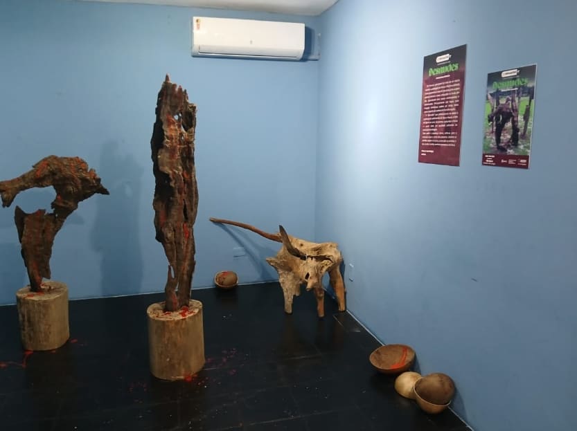 Na instalação “Desnudes”, Paulo Olivença reflete sobre a tensão entre a natureza e o avanço tecnológico. A partir de troncos e vídeos gravados na floresta, o artista constrói uma narrativa sobre a coexistência e o conflito entre o ambiente natural e a “revolução tecnológica sufocante”.