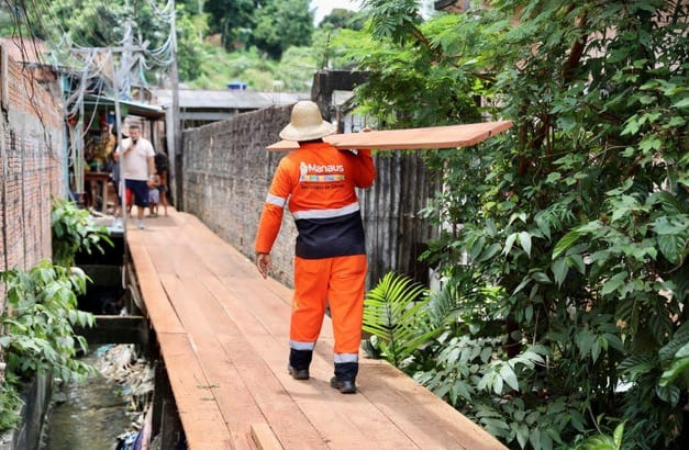 Enquanto o mutirão de obras no bairro Alvorada segue a todo vapor, os distritos de obras da Secretaria Municipal de Infraestrutura (Seminf), da Prefeitura de Manaus, atuam simultaneamente em diversos pontos da capital. Um deles é a construção de aproximadamente 500 metros de ponte de madeira na rua Magalhães Barata, no bairro Crespo, zona Sul da cidade.