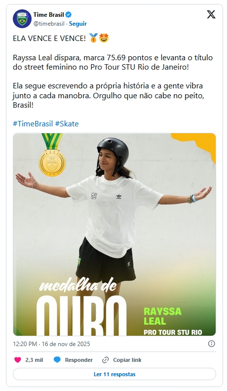 A maranhense Rayssa Leal brilhou muito na manhã deste domingo (16) e conquistou a etapa do Rio do STU Pro Tour, o circuito internacional de skate, na Praça do Ó, na Barra da Tijuca. Esta foi a quinta vez que a medalhista olímpica de 17 anos de idade venceu a competição.
