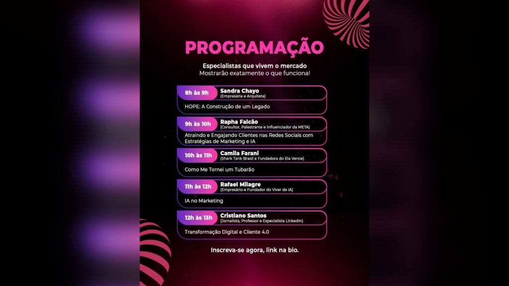 A programação foi estruturada para apresentar, de forma prática, estratégias e tendências que impactam diretamente o desempenho dos negócios no ambiente digital. Às 9h, a empresária e arquiteta Sandra Chayo abre o evento com a palestra “Hope: A Construção de um Legado”, na qual compartilha sua experiência na construção e consolidação de marca, com foco em visão estratégica e posicionamento.