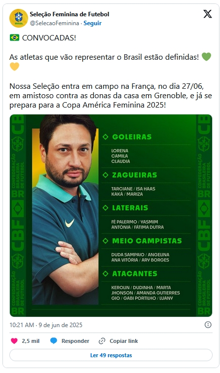 O técnico Arthur Elias convocou nesta segunda-feira (9) as 23 jogadoras da seleção brasileira feminina de futebol que irão em busca do nono título da Copa América. O torneio continenal começa em 12 de julho em Quito (Equador), com a participação de 12 nações. No ataque, o treinador manteve a camisa 10 Marta (Orlando Pride~/EUA), que retornou à seleção nos últimos amistosos contra o Japão, e também as revelações Dudinha (São Paulo) e Jhonson (Corinthians), ambas com 19 anos, que balançaram as redes contra as asiáticas.O poder ofensivo da amarelinha conta ainda com Amanda Gutierres (Palmeiras), Gabi Portilho (Gotham FC/EUA), Gio e Luany (ambas do Atlético de Madrid/Espanha), além de Kerolin (Manchester City/Inglaterrra).