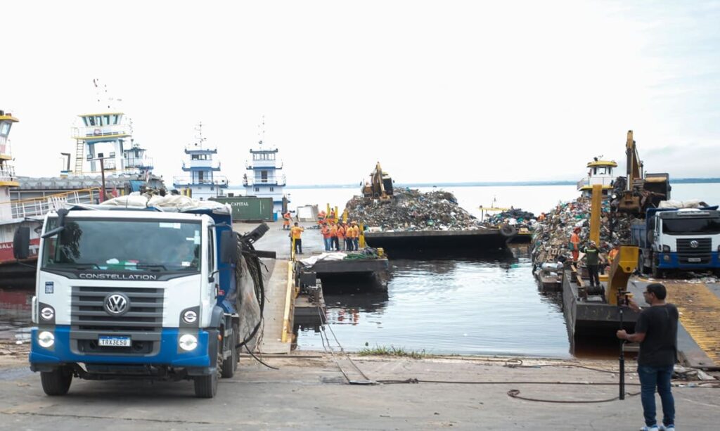 Com o intuito de retirar toneladas de resíduos sólidos acumulados nas áreas alagadas da cidade, a Prefeitura de Manaus, por meio da Secretaria Municipal de Limpeza Urbana (Semulsp), realizou neste sábado, 20/7, a 6ª operação de transbordo do lixo recolhido no leito do rio Negro e dos igarapés da cidade. A ação ocorreu no porto Trairi, bairro Santo Antônio, zona Oeste da capital, e mobilizou dezenas de trabalhadores, balsas, caçambas e maquinários pesados.