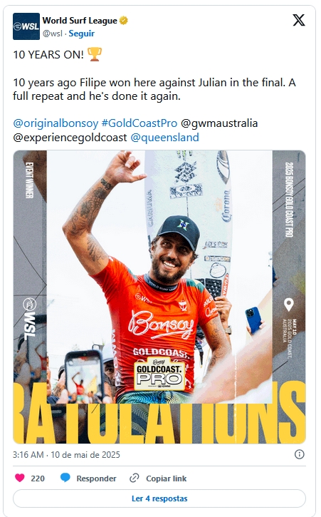 O título deste sábado vem exatamente dez anos após Filipinho derrotar o mesmo Julian Wilson para garantir o troféu da etapa de Gold Coast no ano de 2015.