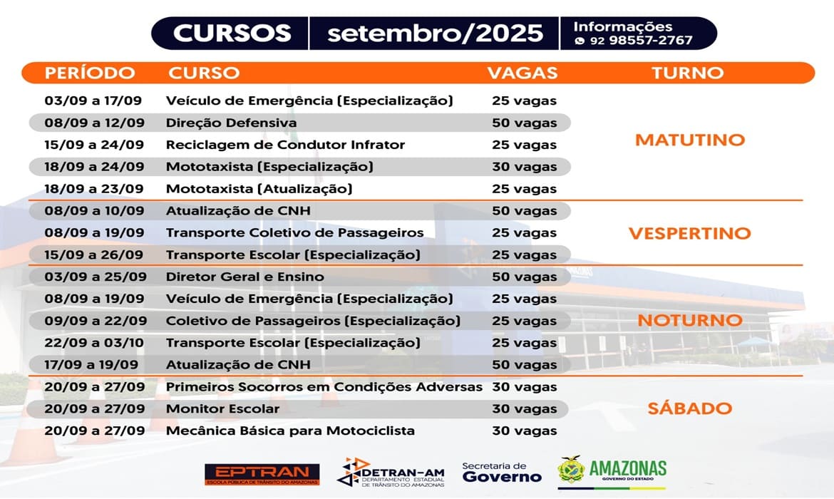 As aulas serão ministradas nos turnos matutino, vespertino, noturno, incluindo os sábados