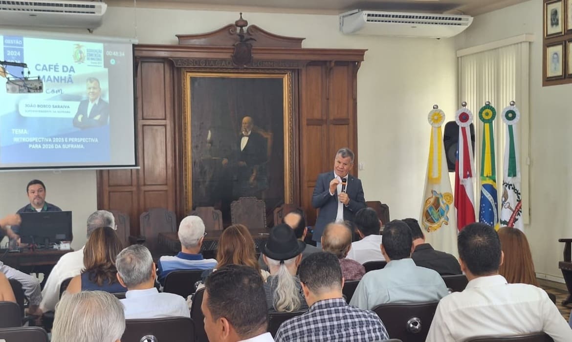 Evento, realizado na sede da entidade sob o formato do “Café Institucional”, reuniu diretoria da Associação Comercial e comitiva da Autarquia para celebrar a trajetória vitoriosa do modelo Zona Franca de Manaus.