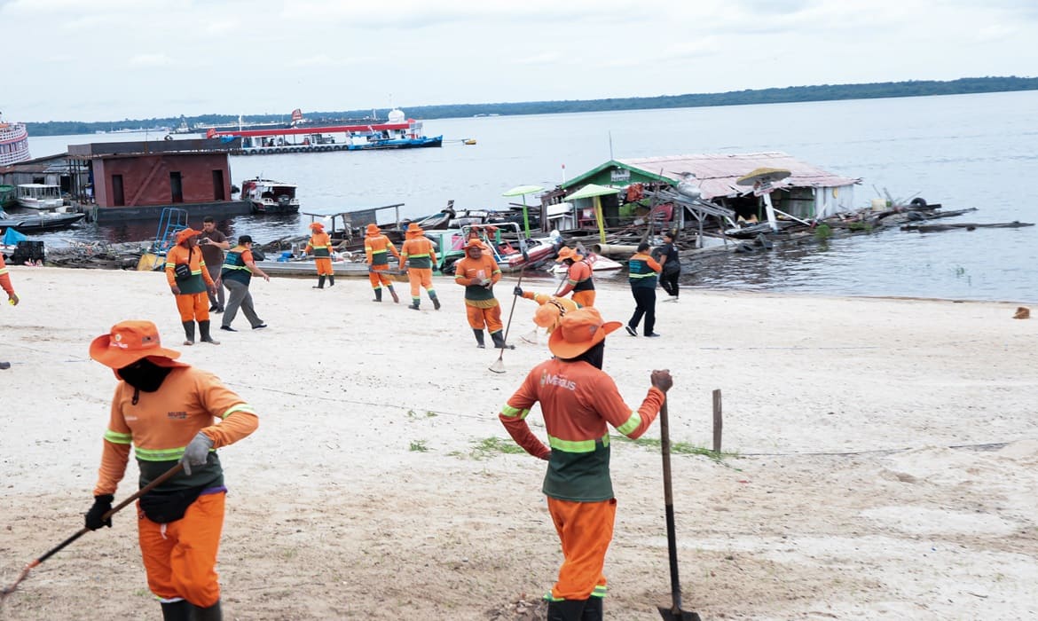 A Prefeitura de Manaus reforça que o trabalho na praia da Ponta Branca seguirá permanente, unindo limpeza, ordenamento