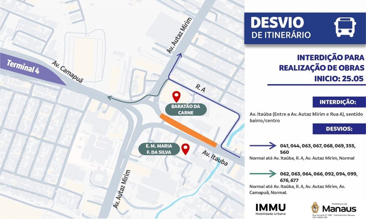 Por causa do desvio, o IMMU orienta os motoristas que trafegam no local a evitar o trecho interditado e buscar caminhos alternativos para alcançar seus destinos.