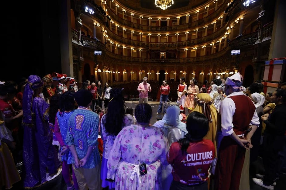 Além das atrações no Largo de São Sebastião, o Teatro Amazonas receberá uma série de apresentações diárias, que seguem até o dia 23 de dezembro. Nesta segunda-feira (08/12), o palco do Teatro apresenta o espetáculo ‘Cristo Ribeirinho’, com o Balé Folclórico do Amazonas, a Orquestra de Violões do Amazonas e artistas convidados.